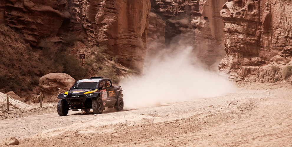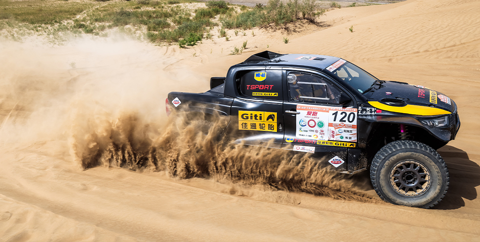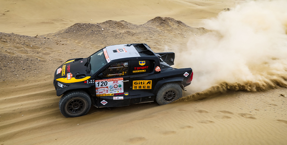 在风沙肆虐的极境之地,佳通轮胎GF-Sport车队再度出征,由车手高枫驾驶全新丰田海拉T1+赛车,搭载专为复合地形打造的Giti4×4 AT200R越野赛事专用轮胎,全力进攻风沙怒吼、碎石如刃的极限赛道。从戈壁深谷到雅丹孤影,从托木尔峡谷到塔克拉玛干沙漠腹地,佳通轮胎Giti4×4 AT200R凭借卓越的越野耐用性与强悍的穿越性能,在环塔火线中稳步驰骋,以科技硬实力直面沙海挑战,助力车手无惧极境、强势完赛。