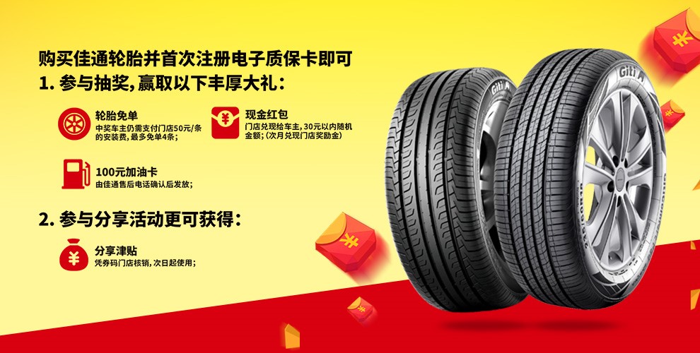 2019年,佳通轮胎全面开展“你换胎,我买单”质保抽奖活动,活动时间由4月16日持续至9月30日,涵盖佳通全系列质保轮胎产品。针对购买佳通乘用车胎产品并首次注册质保的新用户,绑定微信后参与抽奖,赢取轮胎免单、现金红包、100元加油卡等丰厚大礼,分享好友,双方还将获得补换胎福利礼券。
