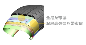 双层高强度钢丝带束层配以高强力全尼龙的冠带层 ,增强胎面刚度,更能支撑胎体受力, 减少了胎面承重产生的蠕变,同时提供优越的操控性