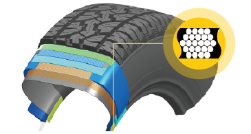 采用开放式的全浸胶式钢丝带束层 , 避免雨水渗入钢丝带束层,而引起的钢丝生锈损坏