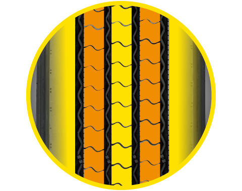 宽胎面设计,高耐磨配方,轮胎耐磨性能好;优化的花纹块比例,均匀花纹块接地压力,有效防偏磨;花纹沟边部密集的细小刀槽纹设计,有效缓解轮胎行驶中的侧向力,减少不规则磨损,提高耐偏磨性能