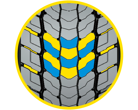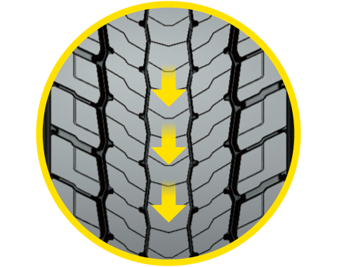 深沟深,二合一大节距花纹设计,提高磨耗体积,耐磨性能好;胎体轮廓优化设计,接地均匀性好,耐磨、防偏磨性能更优;胎肩加强筋设计,增加肩部花纹刚性,抑制不规则磨损,防偏磨性能好