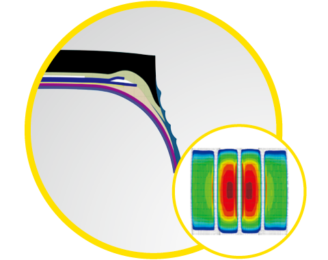 FEA优化肩部轮廓,提升耐屈挠性、耐老化能力;优化带束层结构,降低带束层剪应变能力;低生热肩垫胶配方