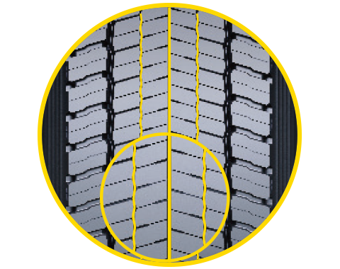 窄胎面,中间3条纵向窄沟+ 深钢片设计,花纹更密集,有效提升花纹中部刚性,降低生热,更省油
