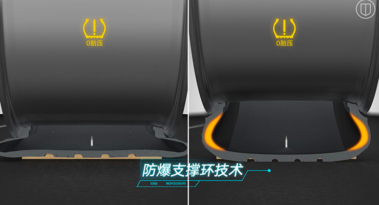 为防止爆胎危险,佳通研发防爆支撑环技术,确保零胎压下车辆行驶安全无忧,正常气压时行驶更舒适。胎侧内部铺设高模量并具有一定耐屈挠特性的支撑胶,配合合理的三角胶形状设计,当轮胎缺气时,支撑胶支撑于轮辋与胎面之间。